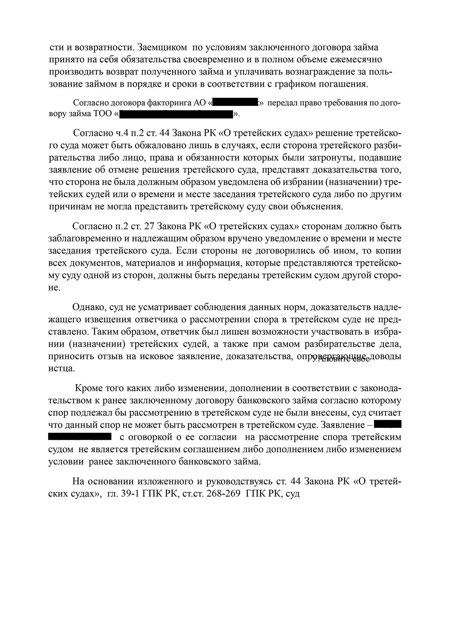 В офис компании обратился Клиент об оказании юридической консультации и в дальнейшем правовой помощи об отмене решения третейского суда «Евразия - Фемида» в городе Алматы, так как Клиент категорично не был согласен Решением третейского суда.